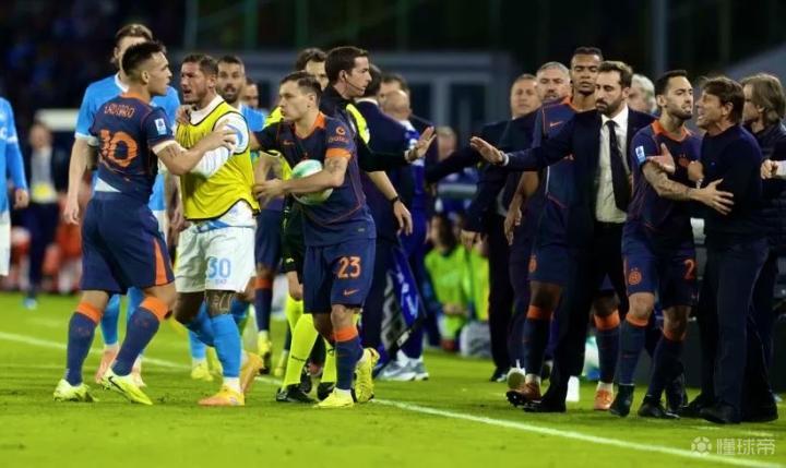 从比赛的回放画面中可以清晰看到,孔蒂最初是与邓弗里斯产生了言语上的争执。紧接着,劳塔罗迅速冲上前来,与孔蒂以及那不勒斯的教练团队展开了激烈的言语对峙。